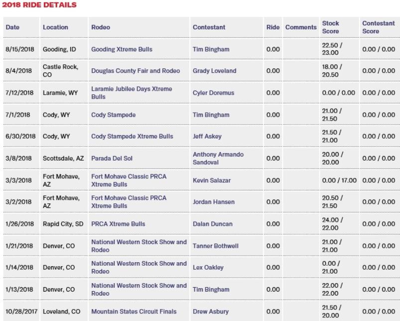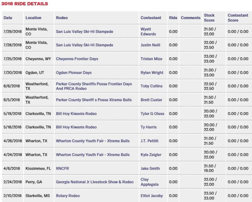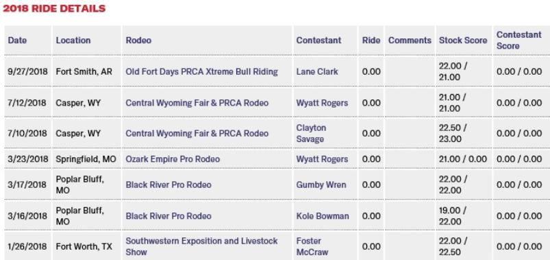| Lot #NFR02 - #1472 Crime Boss - 2018 NFR Bull - $10,500.00 DOB: 03/17/2012 - Left Delivery - ABBI# 10147268 2017 & 2018 NFR Bucking Bull Look at his 2018 PRCA Judges Sheets. 23/23 in Cheyenne!!! Unridden in 2017 & 2018. This is one to take notice of. |