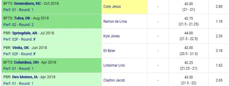 | 2018 NFR Bucking Bull If you are looking for lots of air & action, here is your chance! #324 HeeBee GeeBee has been marked as high as 45.5. This bull can take the Brazilian rope. He has bucked off some of the top Brazillian's in the PBR World Standings. Look at his 2018 PRCA & 2018 PBR outs. |