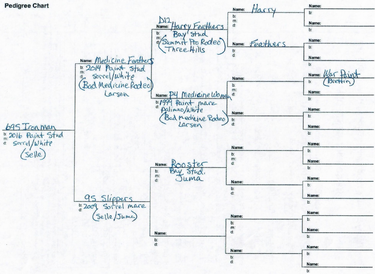 | Lot #15 - #695 Iron Man - $2,600.00 DOB: 2016 - Sorrel / White Paint Stallion - BHBA Registered Here's a son of Medicine Feathers (Bad Medicine Rodeo), who is sired by Harry Feathers and Medicine Woman, of Selle Rodeo's #95 Slippers. Harry Feathers goes back to Three Hills Harry and the great mare Feathers. Slippers goes back to Juma's Rooster stud. Click Here to see Iron Man's full pedigree. Note: Iron Man is BHBA registered, but this pedigree is not DNA verified. The sire, Medicine Feathers, is not registered. His dam, Slippers, is registered, but neither her parents are. This colts has some moves and kicks every time. He was marked 79.5 points at the WFA event in Rapid City, SD to place 5th out of 22 head. 2018 WFA POINTS: 42.5 Consignor: Rand Selle - Selle Rodeo - Bosler, WY |