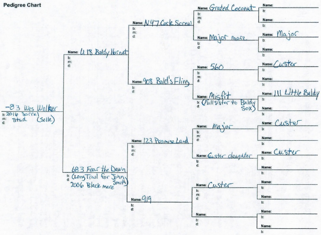 | Lot #13 - #-83 Wes Welker - $2,000.00 DOB: 2016 - Sorrel Stallion - BHBA Registered Here's a son of U18 Baldy Hornet & #683 Fear the Dawn, both of John Smith breeding. Click Here to see his full pedigree. Note: Wes Welker is BHBA registered, but this pedigree is not DNA verified. The sire, Baldy Hornet, is not registered. His dam, Fear the Dawn, is registered, but neither her parents are. Wes Welker was 83.75 points at the WFA event in Duchesne, UT for 2nd place. He was 77.75 points at the WFA event in Kiowa, CO to place 8th out of 25 head. He stays close to the chutes with lots of kick. 2018 WFA POINTS: 44 Consignor: Rand Selle - Selle Rodeo - Bosler, WY |